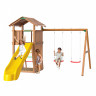 Игровая площадка изготовлена из клееного соснового бруса и массива сосны .Дерево обработано безопасной декоративно-защитной пропиткой. Технология значительно увеличивает срок службы конструкций, повышает прочность древесины, защищает её от гниения и грибков.