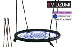 Качели-гнездо Midzumi выполнены из металлической рамы диаметром 60 сантиметров, с дополнительной защитной оплеткой ее бортиков, обтянутых прочным синтетическим канатом толщиной 10 мм выдерживающим нагрузку 100 кг. Плетеное синтетическое сидение качелей удобное и практичное, не собирает грязь и воду, при сильных загрязнениях его можно протереть.